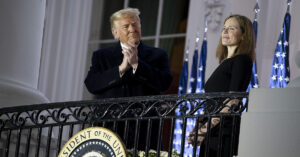 WASHINGTON, DC – OCTOBER 26: U.S. President Donald Trump stands with newly sworn in U.S. Supreme Court Associate Justice Amy Coney Barrett during a ceremonial swearing-in event on the South Lawn of the White House October 26, 2020 in Washington, DC. The Senate confirmed Barrett’s nomination to the Supreme Court today by a vote of 52-48. (Photo by Tasos Katopodis/Getty Images)