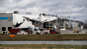 A collapsed roof is seen at an Amazon distribution center after a tornado hits Edwardsville, in Illinois, U.S. December 11, 2021. REUTERS/Lawrence Bryant