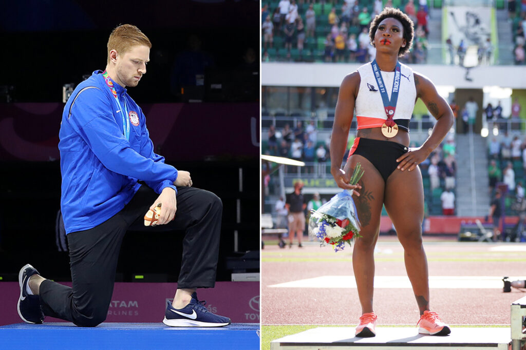 Gold medalist Race Imboden of United States takes a knee during the National Anthem Ceremony in the podium of Fencing Men’s Foil Team Gold Medal Match Match on Day 14 of Lima 2019 Pan American Games at Fencing Pavilion of Lima Convention Center on August 09, 2019 in Lima, Peru. Gwendolyn Berry (L), third place, looks on during the playing of the national anthem.