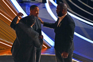 US actor Denzel Washington (L), US actor Will Smith (C) and US actor-producer Tyler Perry chat during the 94th Oscars at the Dolby Theatre in Hollywood, California on March 27, 2022. (Photo by Robyn Beck / AFP) (Photo by ROBYN BECK/AFP via Getty Images)